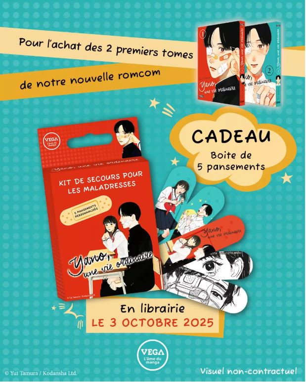 Les deux premiers tomes de Yano, une vie ordinaire seront disponibles le 3 octobre 2025. Pour célébrer cette sortie, Vega propose un cadeau exclusif : un kit de cinq pansements rappelant les petits accidents du héros maladroit. 🎀