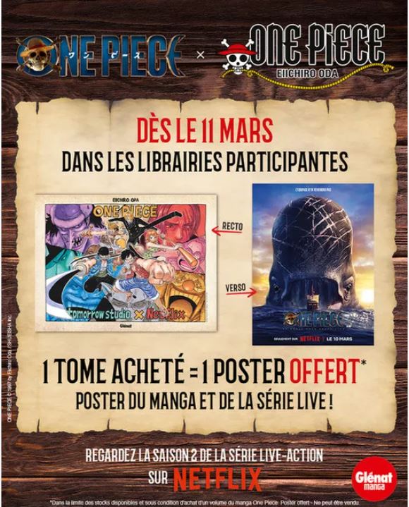 Les fans de One Piece ont de quoi se rĂ©jouir ! Pour cĂ©lĂ©brer la sortie de la saison 2 de lâadaptation live sur Netflix le 10 mars 2026, les Ă©ditions GlĂ©nat Manga lancent une offre spĂ©ciale en librairie. Ă partir du 11 mars, pour lâachat dâun tome de One Piece, les lecteurs pourront recevoir un poster recto-verso exclusif : dâun cĂŽtĂ© une illustration du manga, de lâautre lâaffiche officielle de la sĂ©rie live.