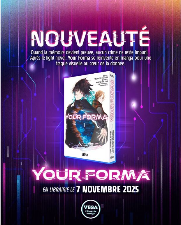 Le premier tome de Your Forma – Le manga sortira en librairie le 7 novembre 2025, au prix de 8,35 €. Une parution qui viendra enrichir la collection science-fiction et enquête de Vega, et qui s’annonce déjà comme une lecture incontournable pour les amateurs d’univers technologiques profonds.