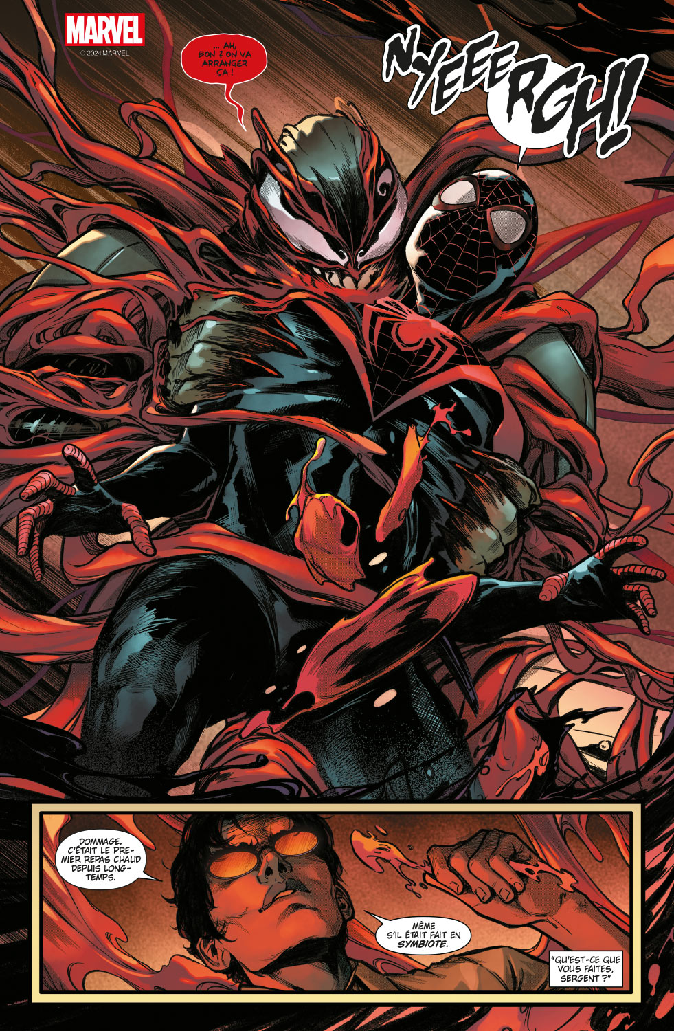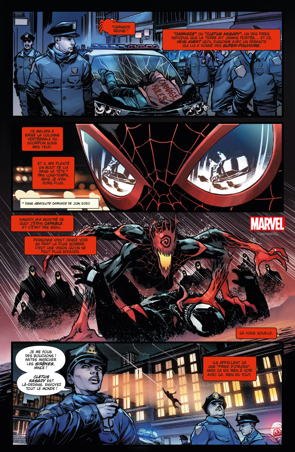 Le crossover entre Carnage et Miles Morales ! Cletus Kasady, disposant désormais des pouvoirs cumulés de la technologie Stark et du symbiote dragon, lance une croisade sanguinaire sur New York pour rappeler au monde qui est Carnage. Seul Miles Morales semble pouvoir entraver ses plans…
