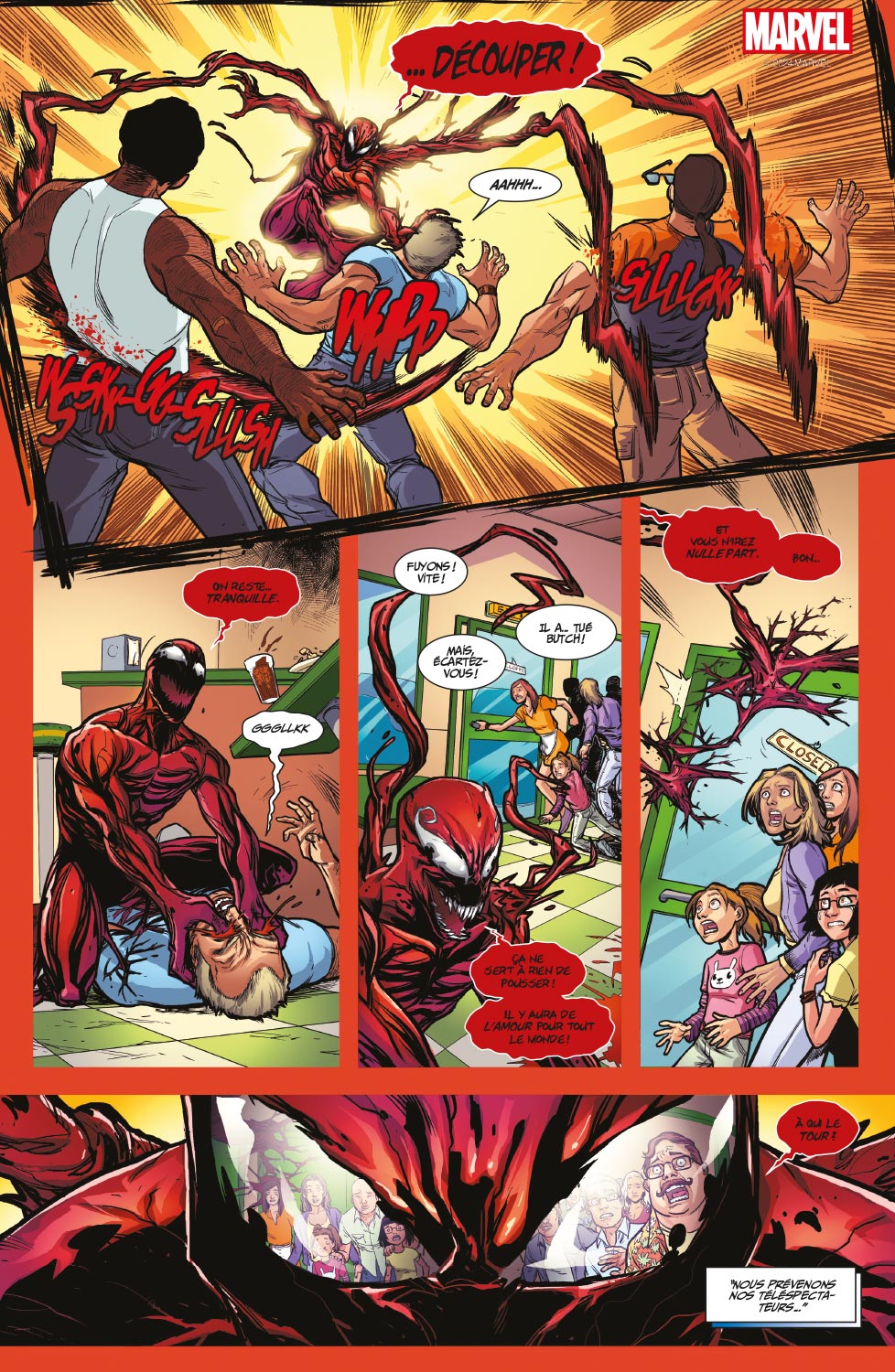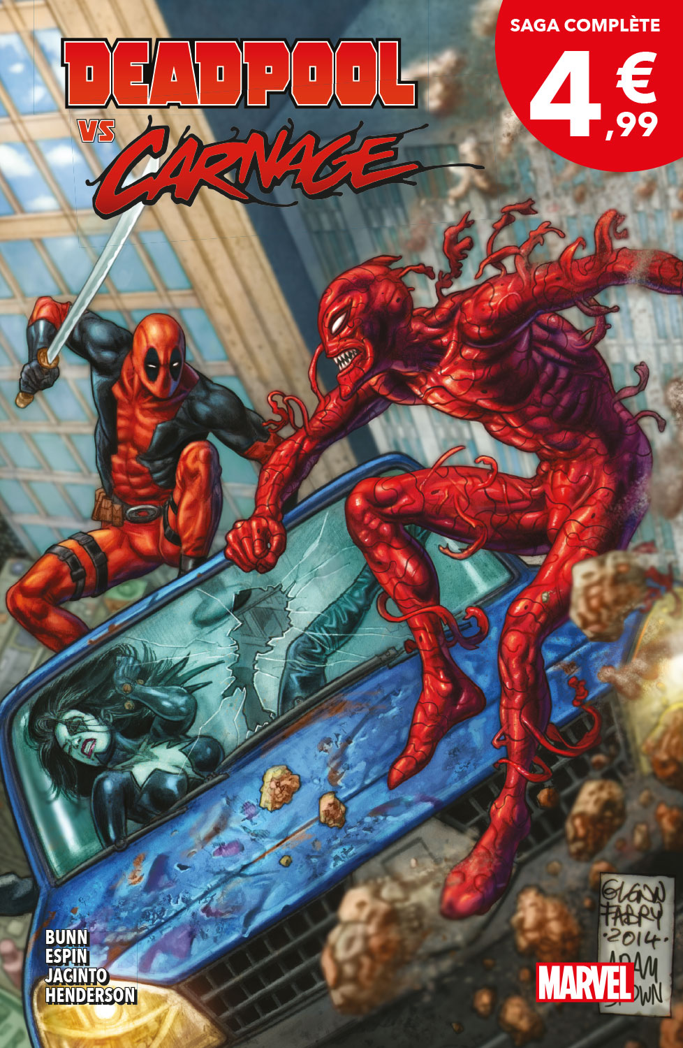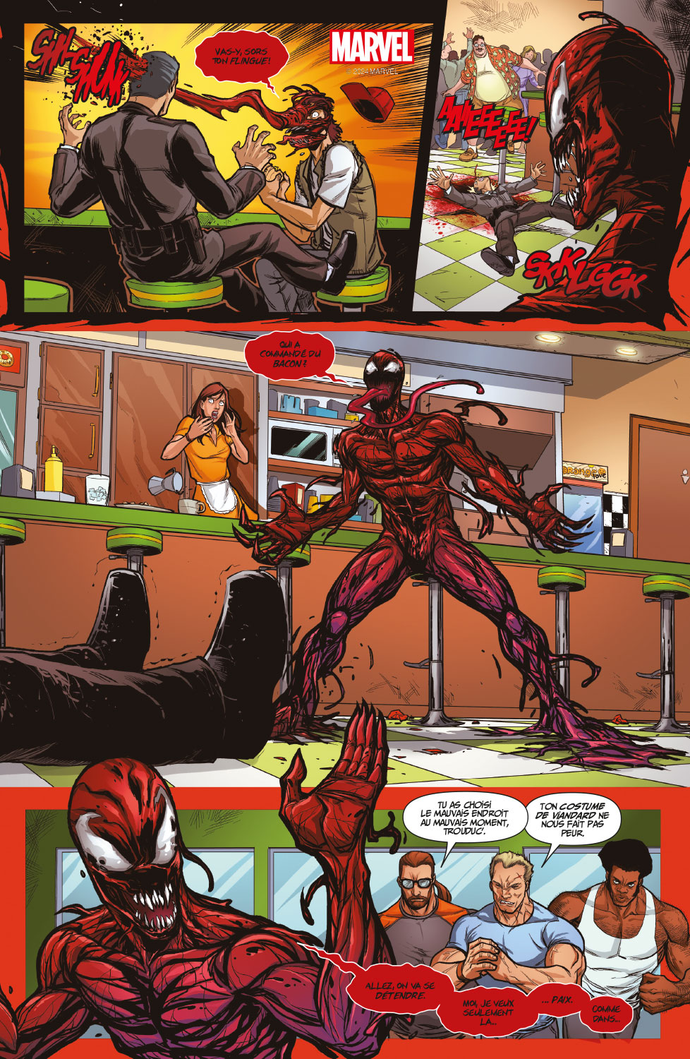Deux cinglés en costume rouge pour le prix d’un ! À votre gauche, Deadpool, le cinglé gentil. À votre droite, Carnage, le cinglé très très méchant. L’issue du combat est incertaine, mais une chose est sûre : ça va saigner !