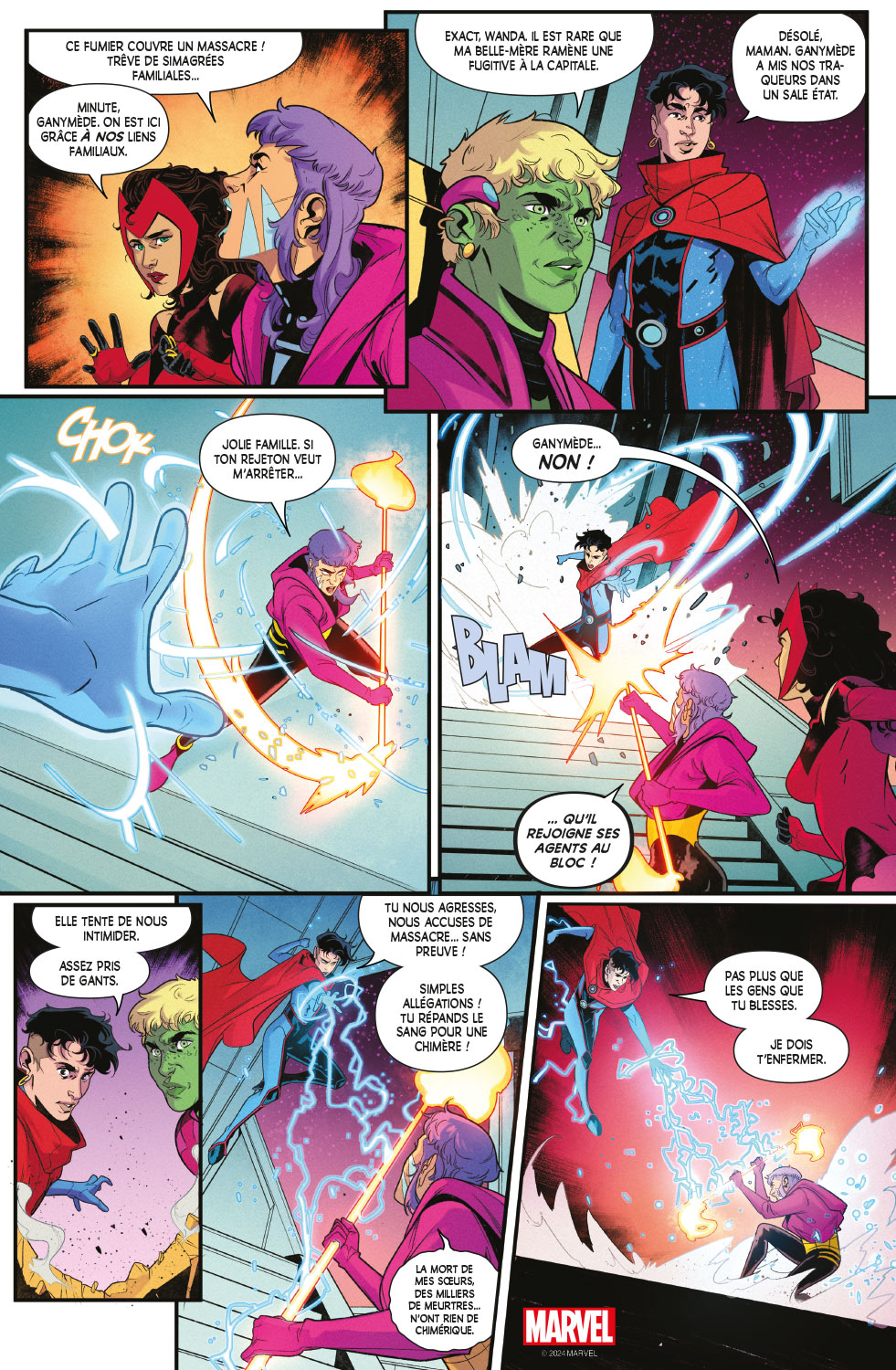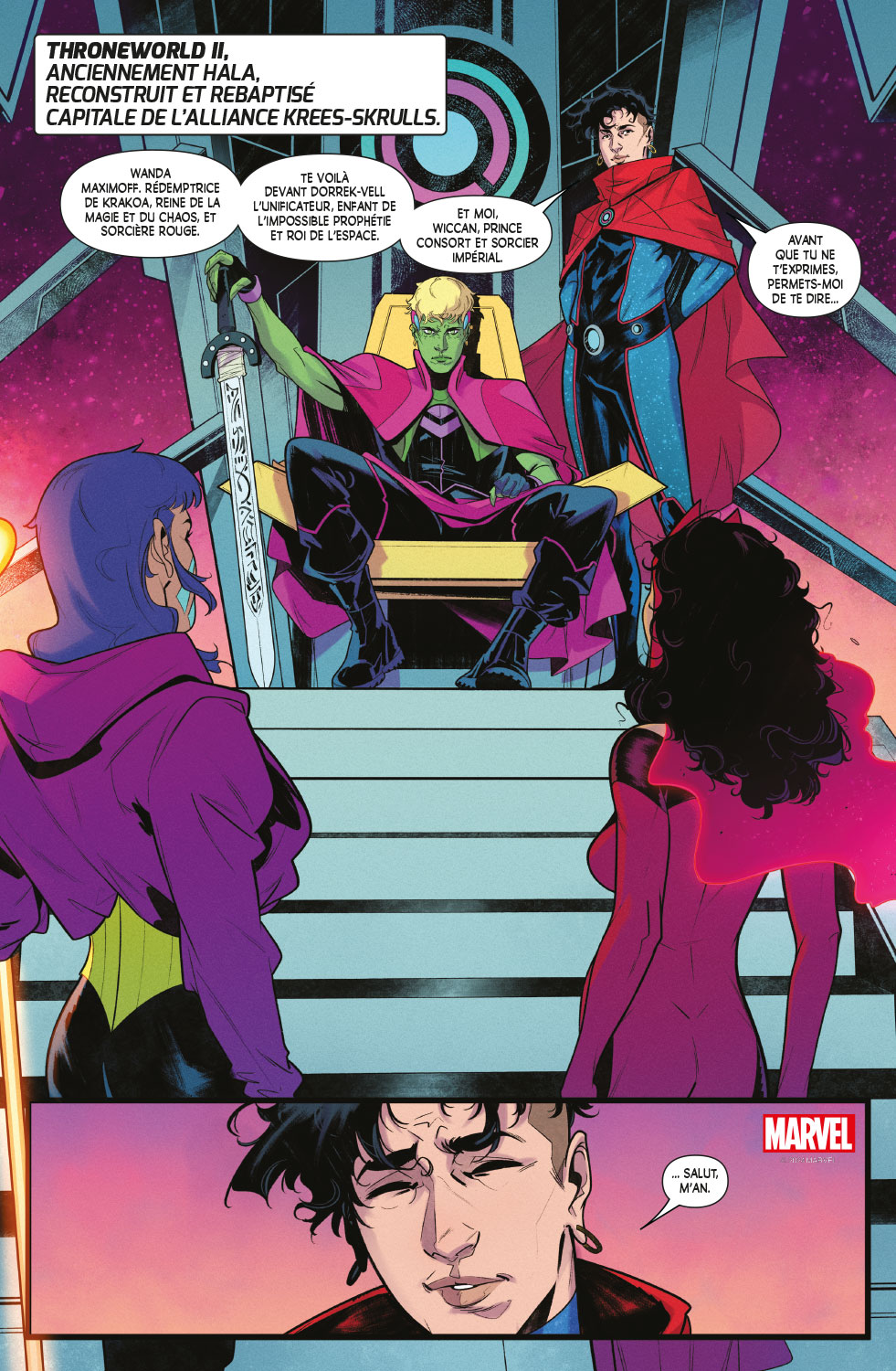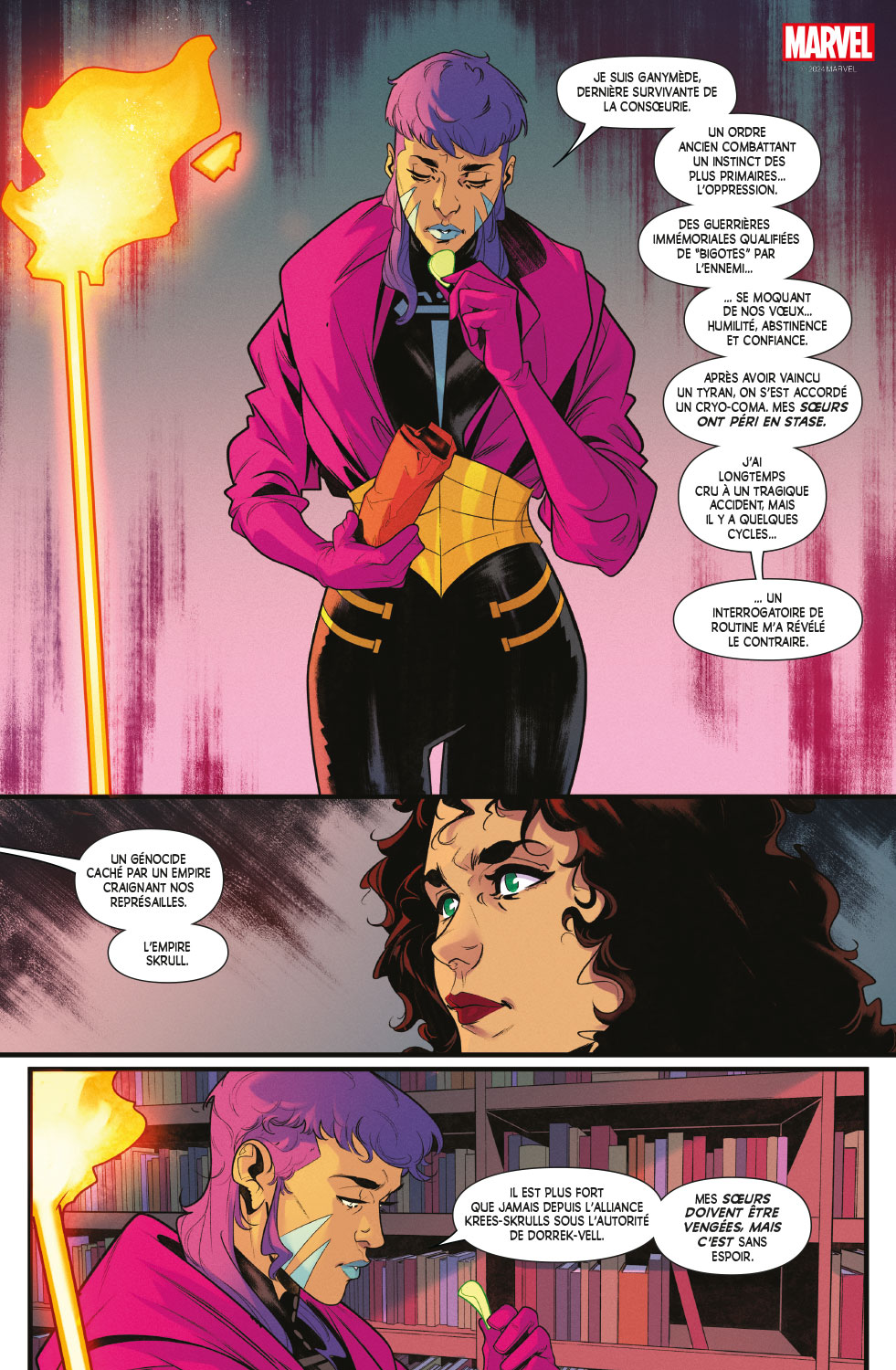 Les âmes en peine continuent d’affluer à l’officine mystique de la Sorcière Rouge. Parmi elles, Ganymède, seule survivante d’un ordre de guerrières décimées par les Skrulls. Pour épauler la jeune femme dans sa quête de justice, Wanda plaide sa cause devant Hulkling et Wiccan.