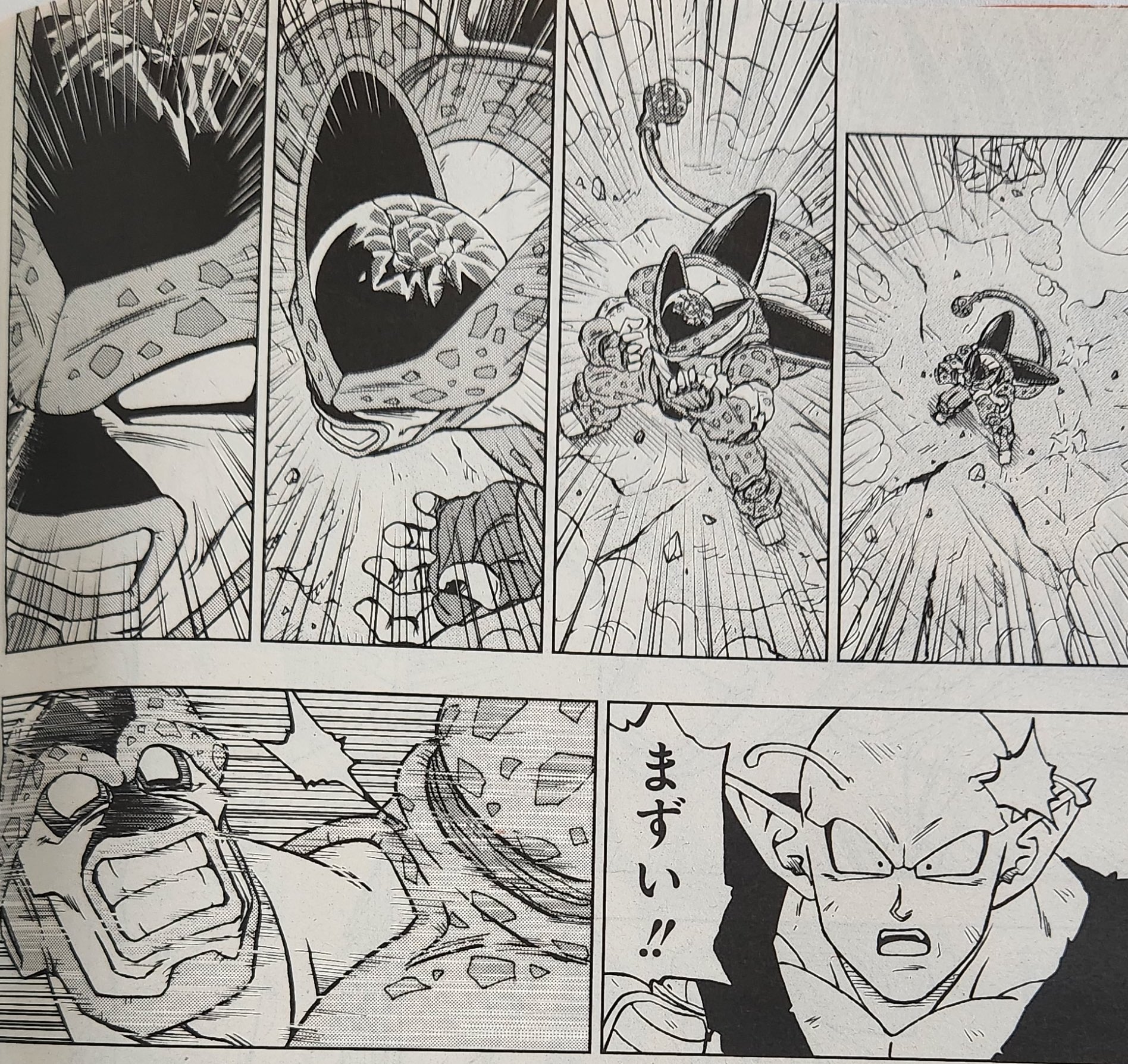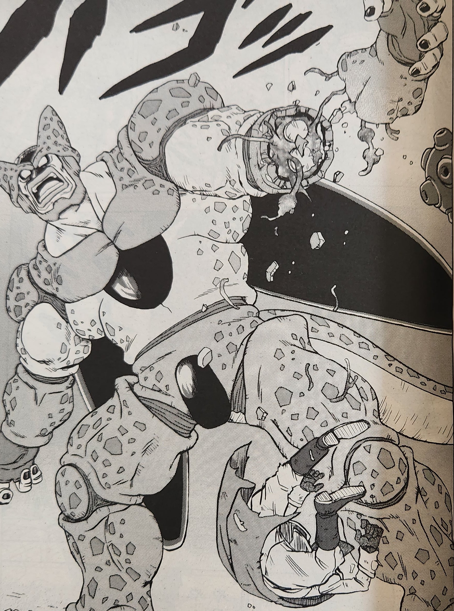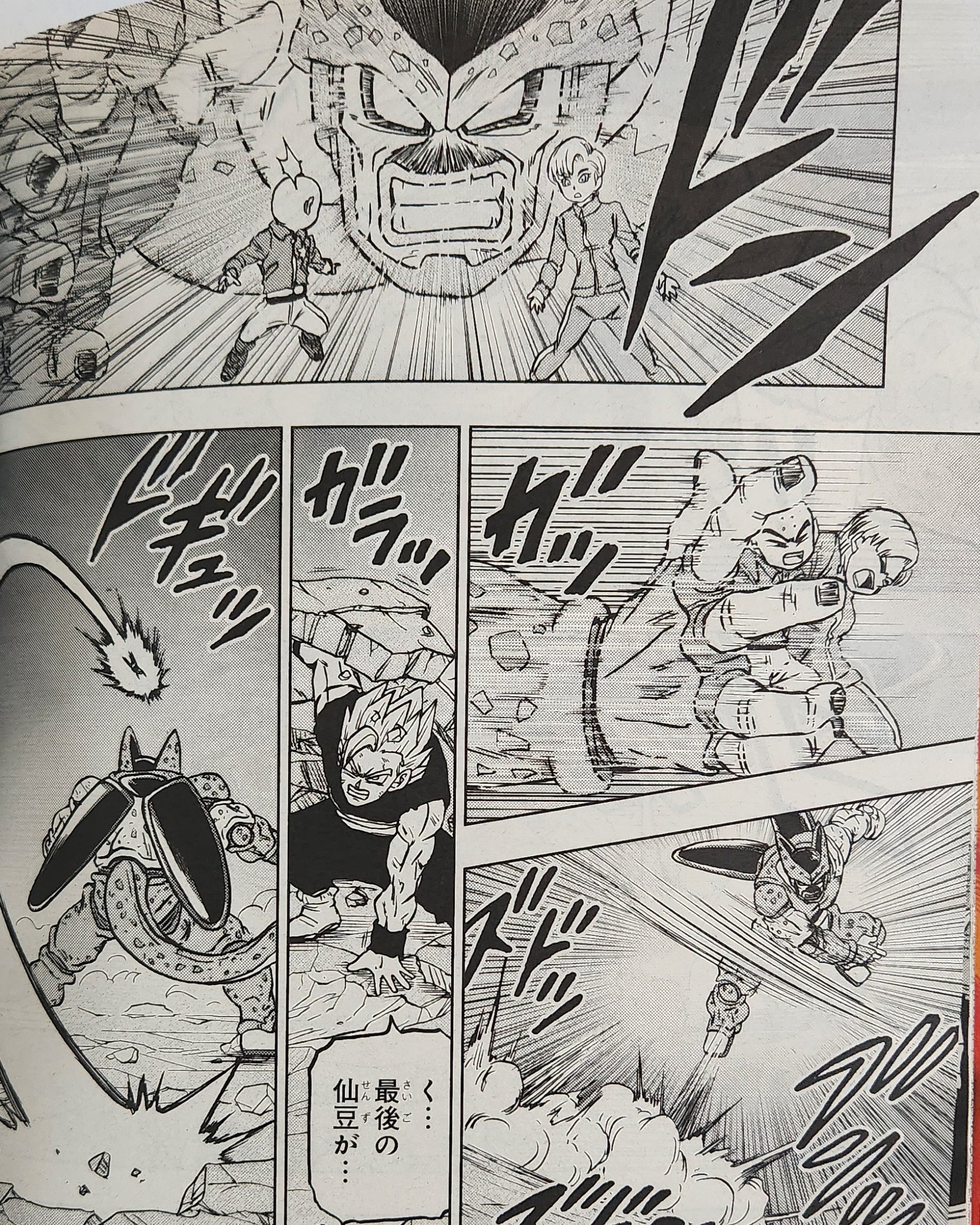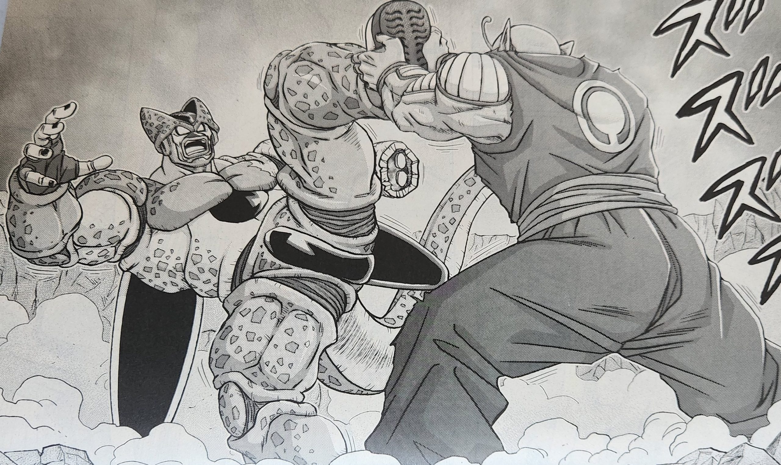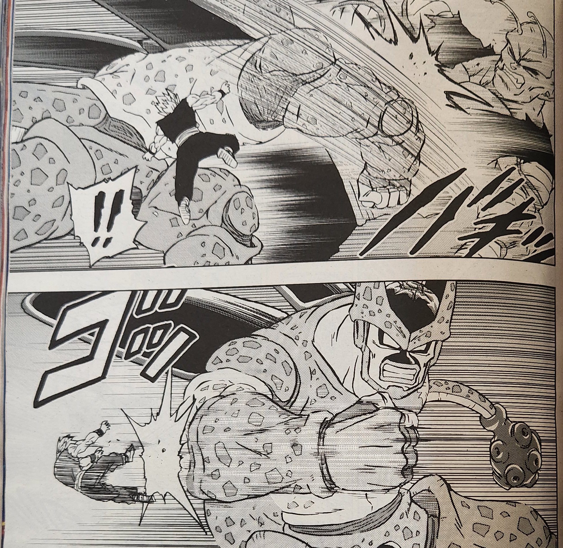 Dans le chapitre « La résolution de Gamma 2« , Krillin, Piccolo, Gamma 2 et Gohan se retrouvent confrontés à Cell Max, un adversaire redoutable qui met nos héros en difficulté. Dans un acte de bravoure, Gamma 2 se sacrifie pour tenter de vaincre cet antagoniste puissant, bien que sa mort reste encore à confirmer. Cell Max empêche également Gohan de se soigner avec un Senzu, mais l’intervention de Pan vient changer la donne. Pendant ce temps, Orange Piccolo se prépare à un duel avec la nouvelle version de Cell, créée par le Dr. Hedo. Cependant, la suite de ce combat reste en suspens.
