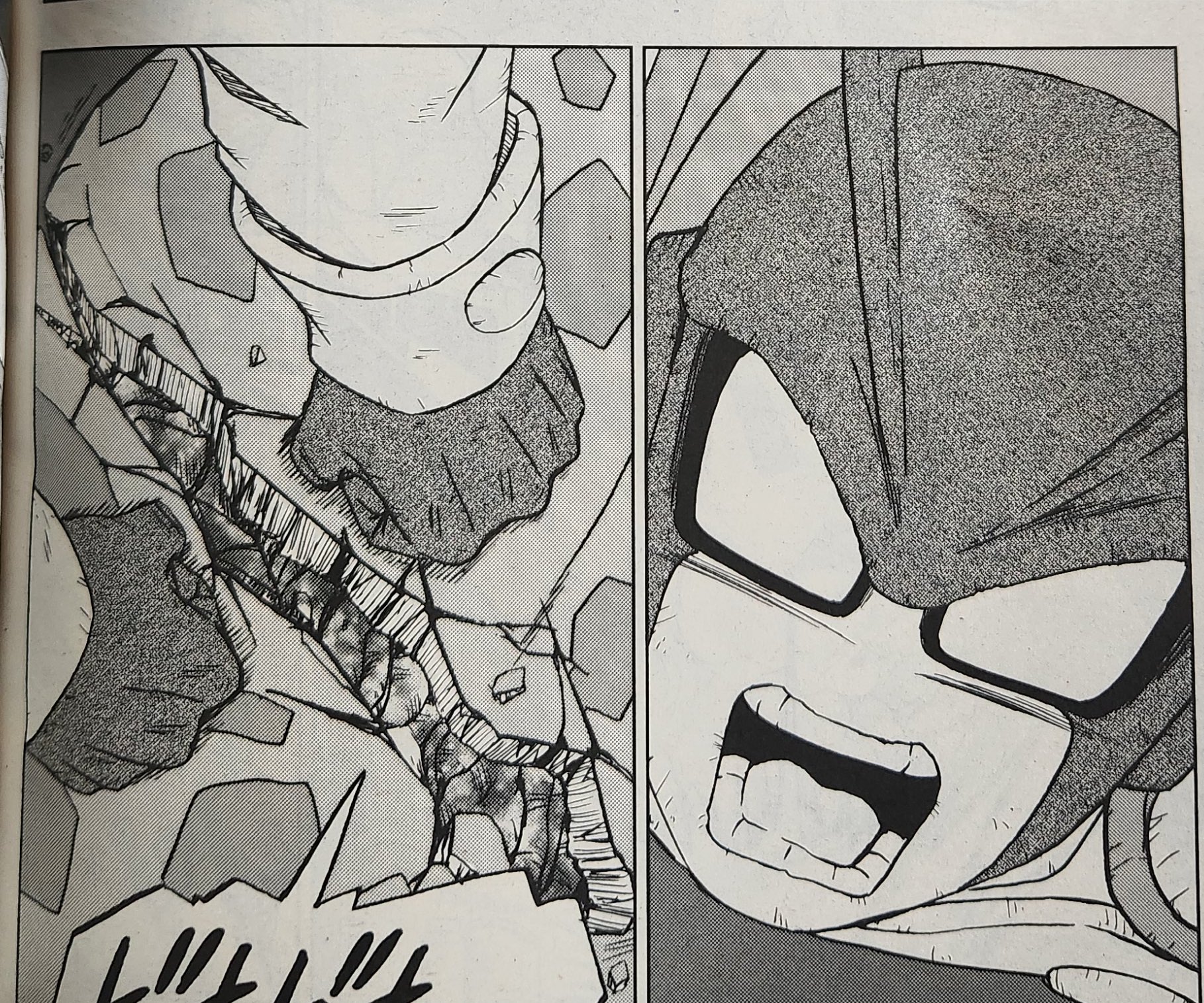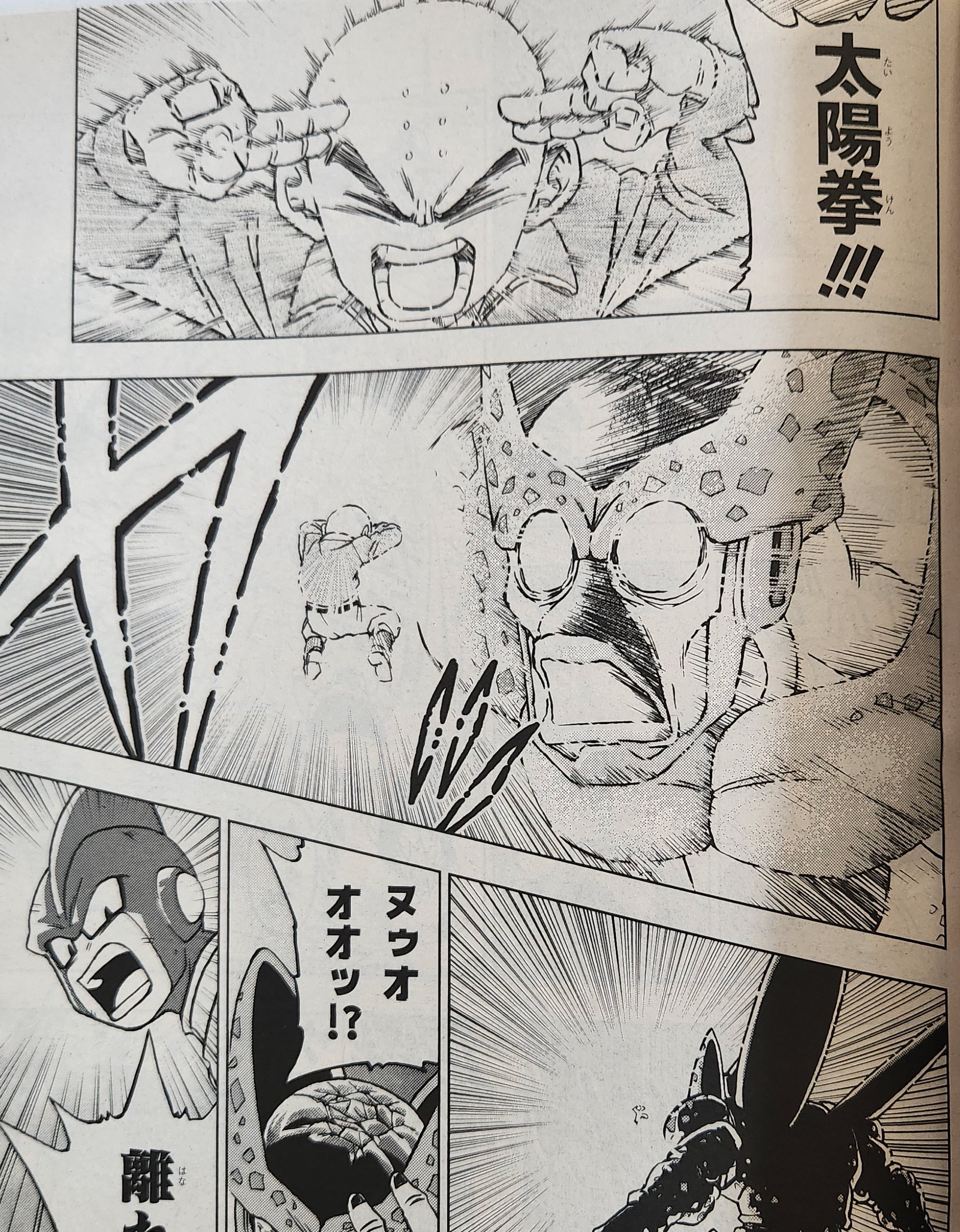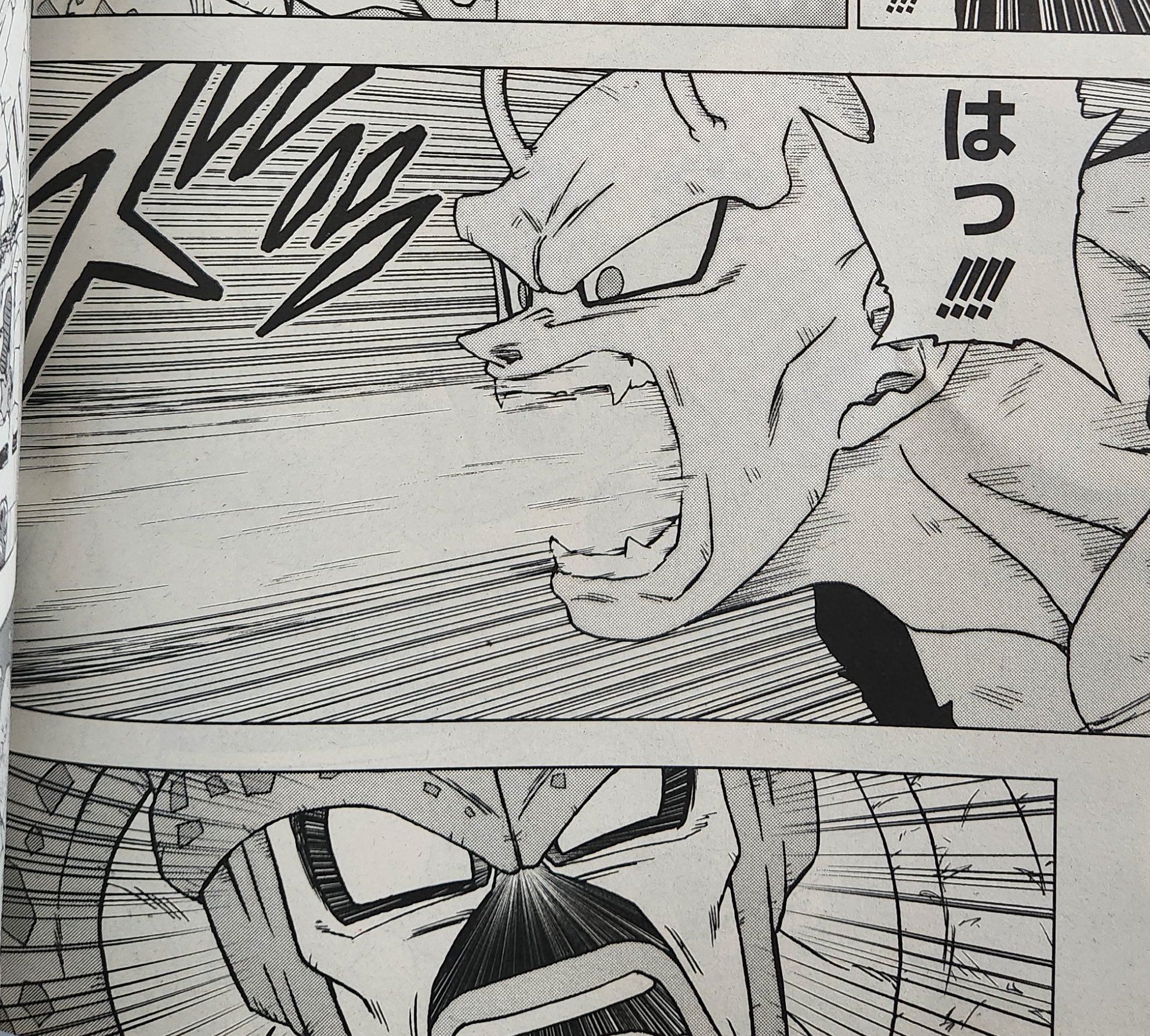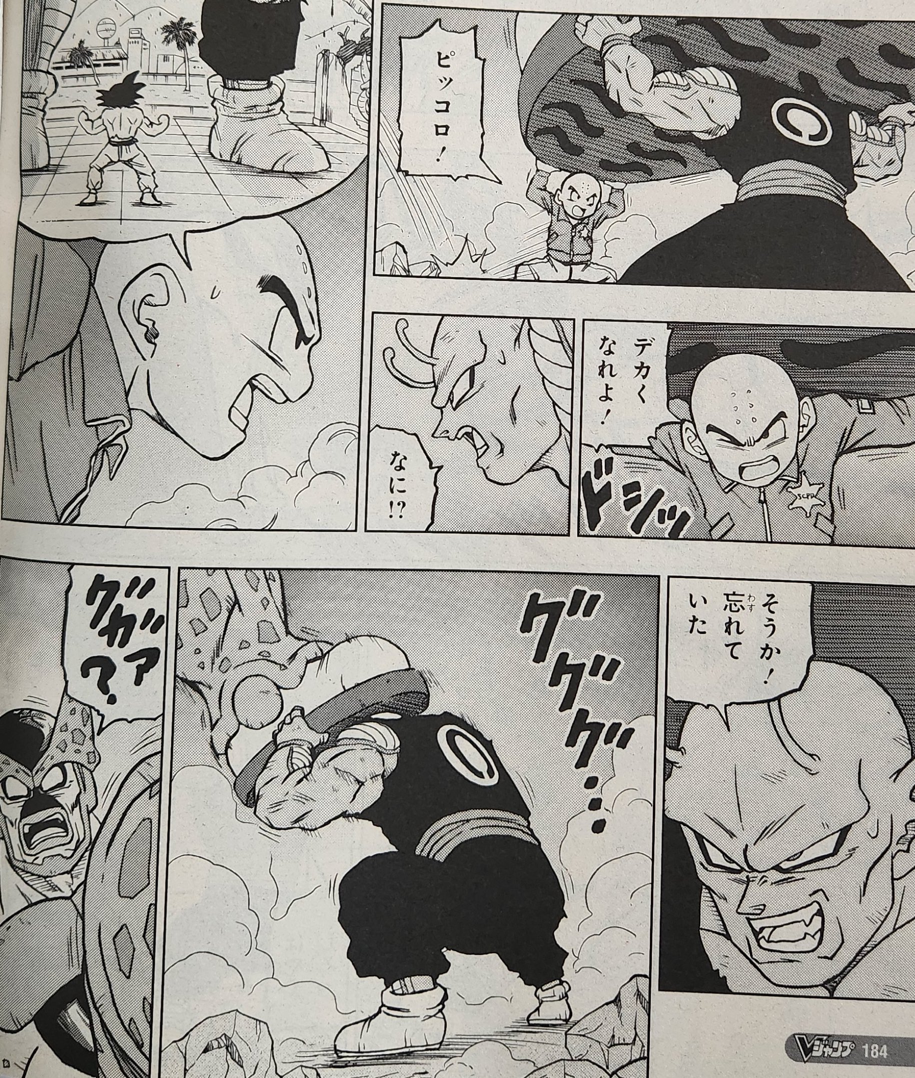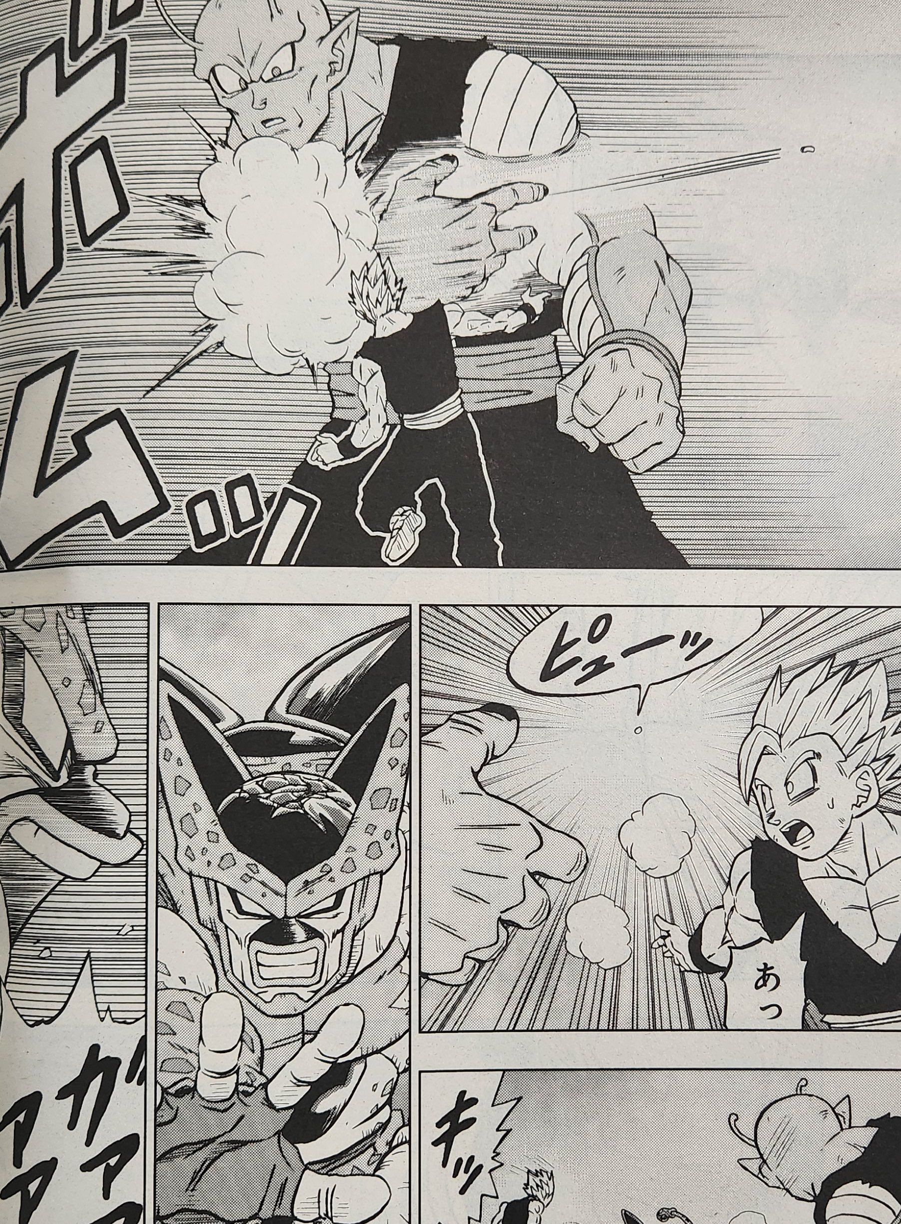 Dans le chapitre « La résolution de Gamma 2« , Krillin, Piccolo, Gamma 2 et Gohan se retrouvent confrontés à Cell Max, un adversaire redoutable qui met nos héros en difficulté. Dans un acte de bravoure, Gamma 2 se sacrifie pour tenter de vaincre cet antagoniste puissant, bien que sa mort reste encore à confirmer. Cell Max empêche également Gohan de se soigner avec un Senzu, mais l’intervention de Pan vient changer la donne. Pendant ce temps, Orange Piccolo se prépare à un duel avec la nouvelle version de Cell, créée par le Dr. Hedo. Cependant, la suite de ce combat reste en suspens.