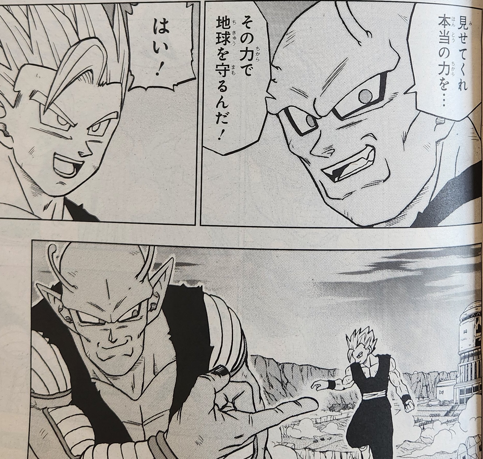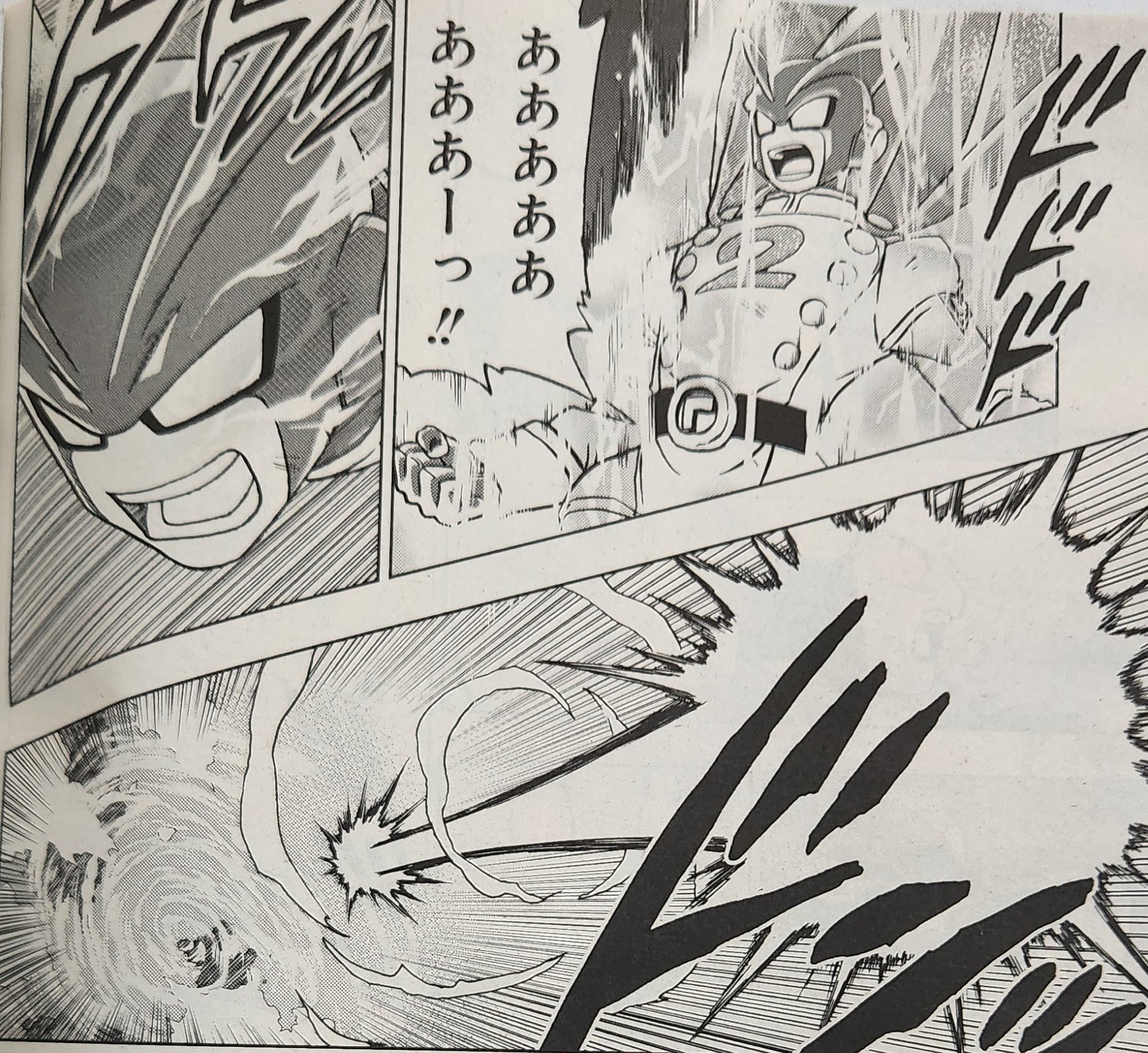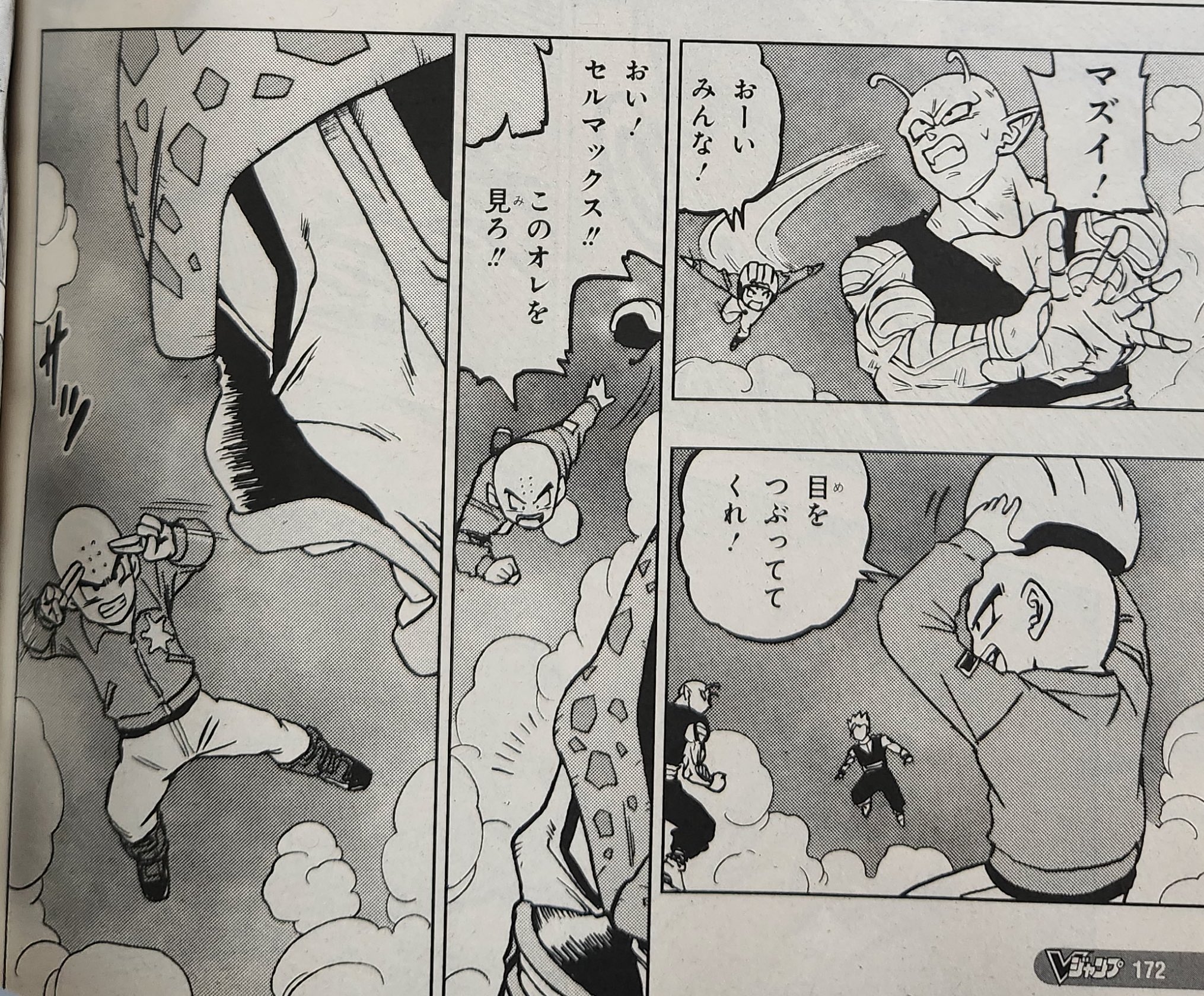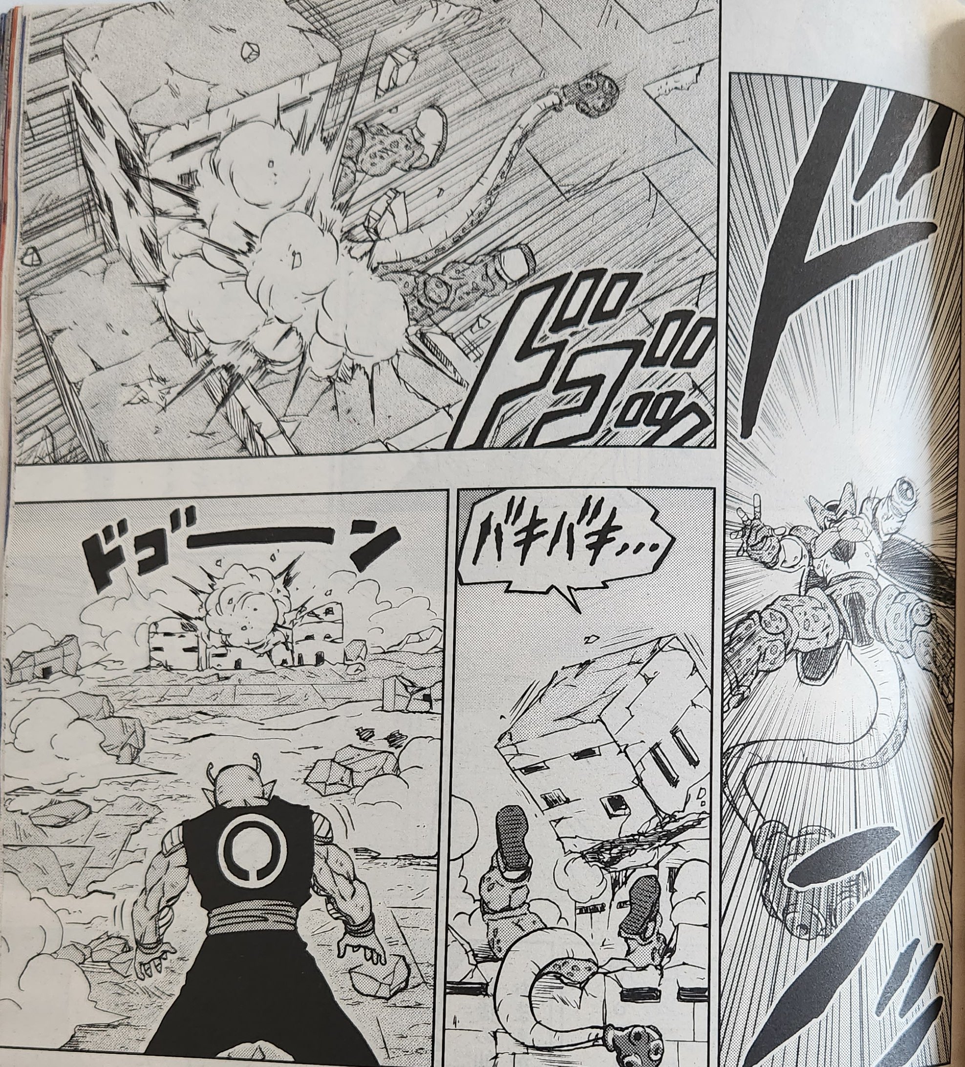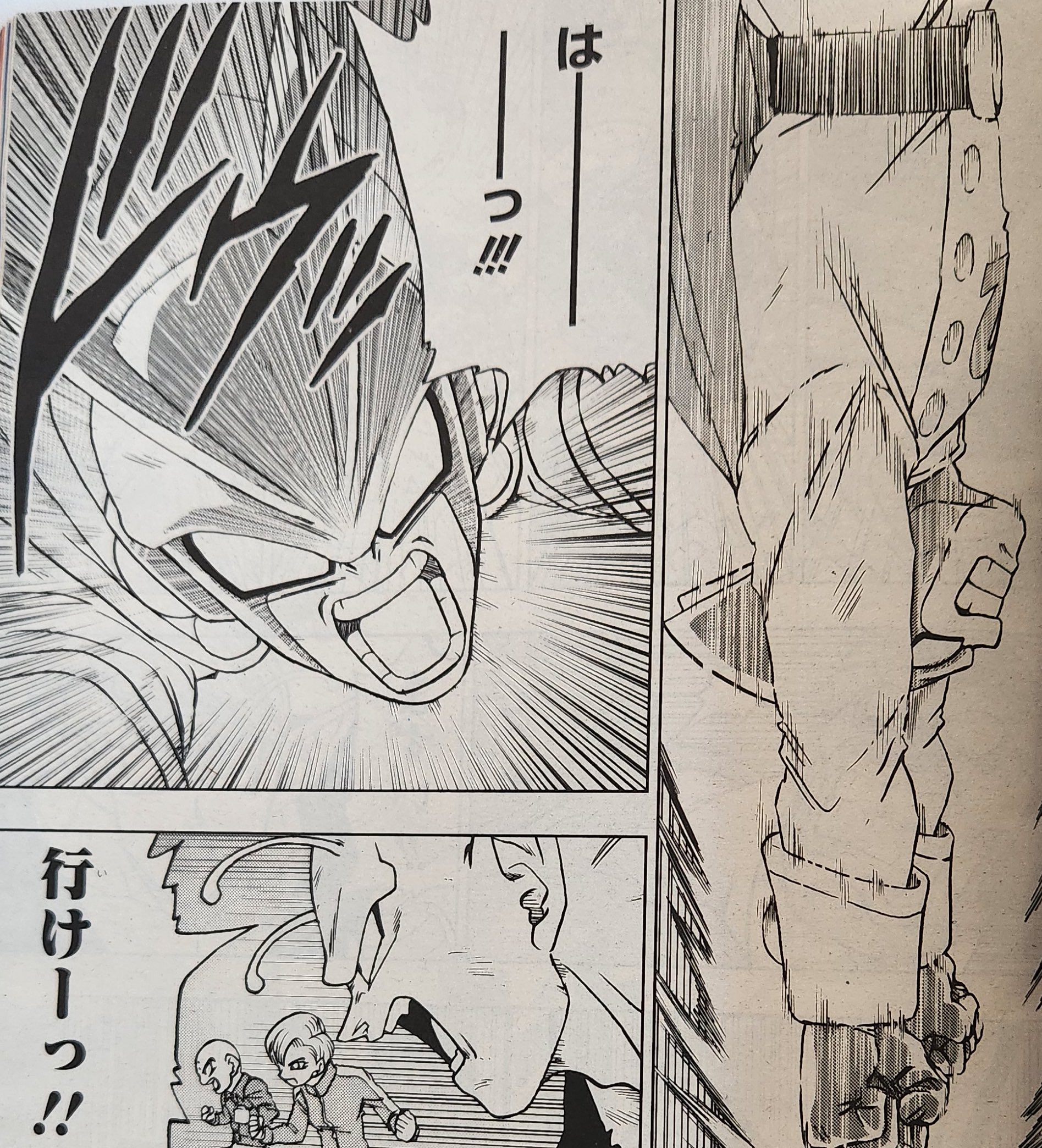 Dans le chapitre « La résolution de Gamma 2« , Krillin, Piccolo, Gamma 2 et Gohan se retrouvent confrontés à Cell Max, un adversaire redoutable qui met nos héros en difficulté. Dans un acte de bravoure, Gamma 2 se sacrifie pour tenter de vaincre cet antagoniste puissant, bien que sa mort reste encore à confirmer. Cell Max empêche également Gohan de se soigner avec un Senzu, mais l’intervention de Pan vient changer la donne. Pendant ce temps, Orange Piccolo se prépare à un duel avec la nouvelle version de Cell, créée par le Dr. Hedo. Cependant, la suite de ce combat reste en suspens.