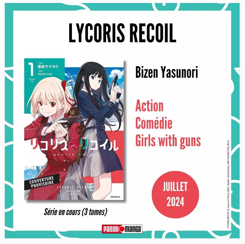 Également, toute la saga Lycoris Recoil arrivera en France cet été, incluant probablement l’anthologie « Lycoris Recoil React« . Cette série, prépubliée au Japon entre 1997 et 1999, promet un récit palpitant avec Nobuyuki Fukumoto au scénario et Kaiji Kawaguchi au dessin.