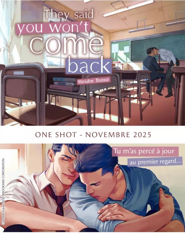 Les éditions Akata continuent de dévoiler leurs nouveautés à l’approche de la Y-Con, avec l’annonce de They Said You Won’t Come Back, un one-shot boy’s love attendu pour le 13 novembre au prix de 8,50 €.