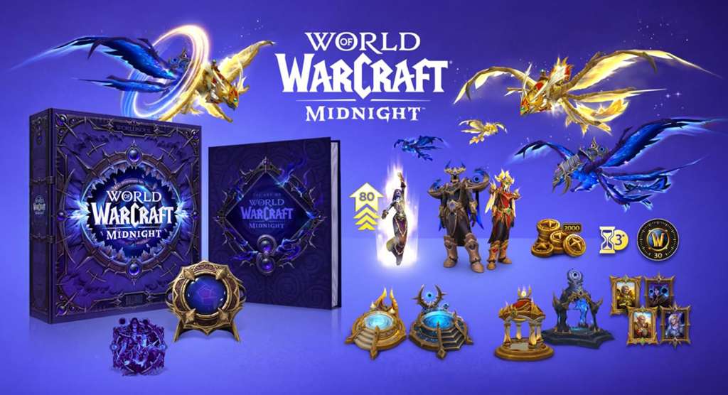 Contenu en jeu de l’édition Midnight Epic : objets d’ameublement, animaux de compagnie Hopeflutter et Doomfeathers, ensembles de transmogrification d’armure Lighstrider Raiment et Voidstrider Raiment, montures Voidlight Surger, Lightwing Dragonhawk et Voidwing Dragonhawk.